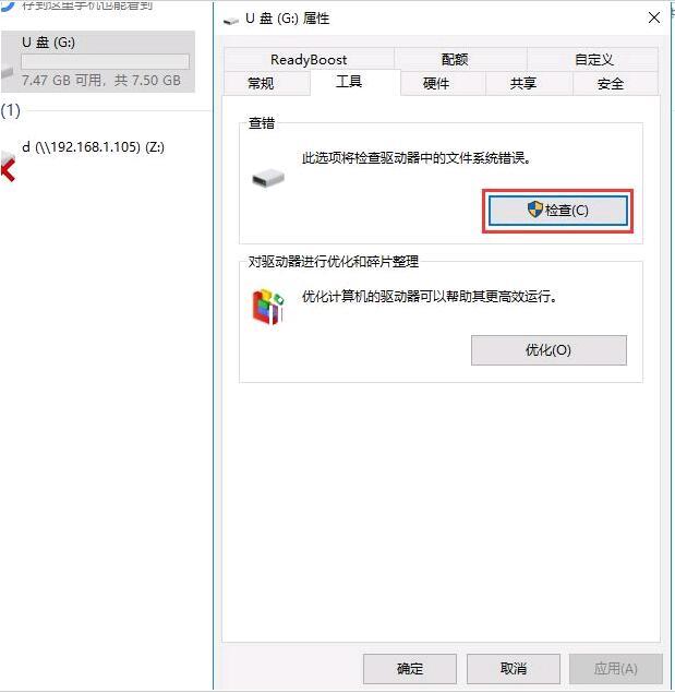 2、在打开的属性窗口上部点击工具选项卡,然后在工具选项卡中点击检查。
