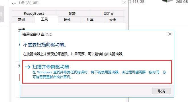 3、在弹出的对话框中点击扫描并修复驱动器,待扫描修复完成后即可解决由逻辑坏道引起的U盘写保护。