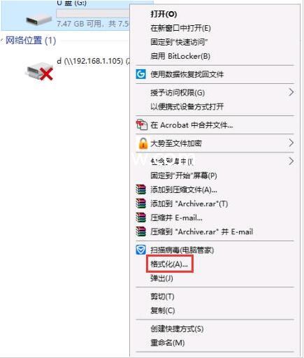 1、这时候就需要对该U盘进行低格。在U盘的上方点击右键,在弹出的菜单中点击格式化。