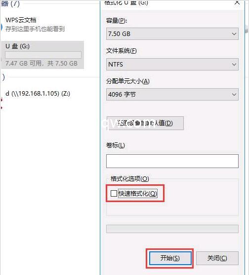 2、在弹出的窗口中取消勾选快速格式化,然后点击开始即可,待格式化完成即可。