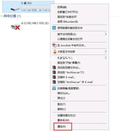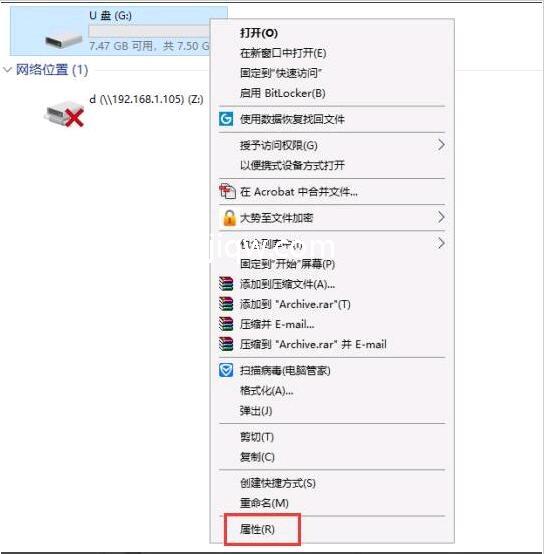 5、由于逻辑坏道导致的写保护。一般的逻辑坏道很好解决,在U盘盘符的上方点击右键,在弹出的窗口中点击属性。