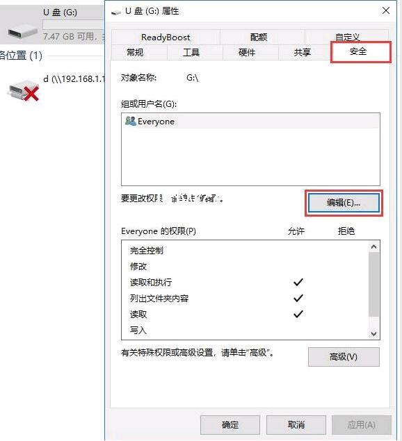 3、在属性窗口上方找到并点击安全,在安全选项卡中部找到并点击编辑。