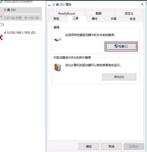 6、在打开的属性窗口上部点击工具选项卡,然后在工具选项卡中点击检查。