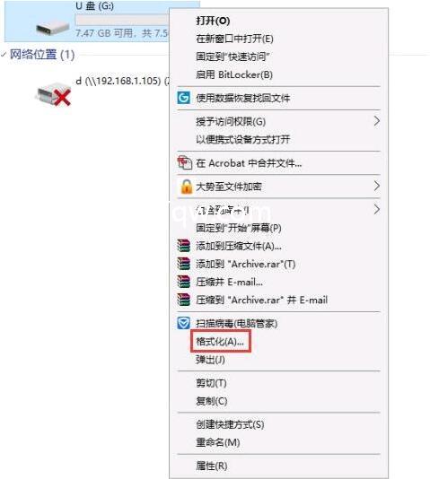 8、物理坏道导致的U盘写保护,那么就需要对该U盘进行低格。在U盘的上方点击右键,在弹出的菜单中点击格式化。