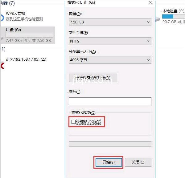 9、在弹出的窗口中取消勾选快速格式化,然后点击开始即可,待格式化完成即可。