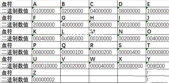 注意,hex:后面的值是你要隐藏的盘符二进制代码,下图是我们整理的盘符对应二进制编码表,注意格式为xx,xx,xx,xx,其中逗号是英文标点,不要搞错。