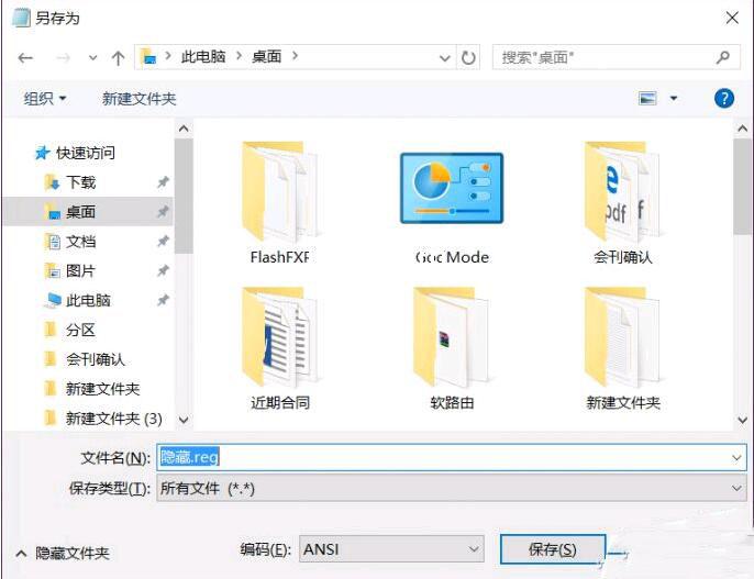 输入完毕,点击记事本左上的“文件”选择“另存为”,然后在弹出界面中的“保存类型”下选择“所有文件(*.*)”,输入文件名,注意后缀为.reg,例如“隐藏.reg”
