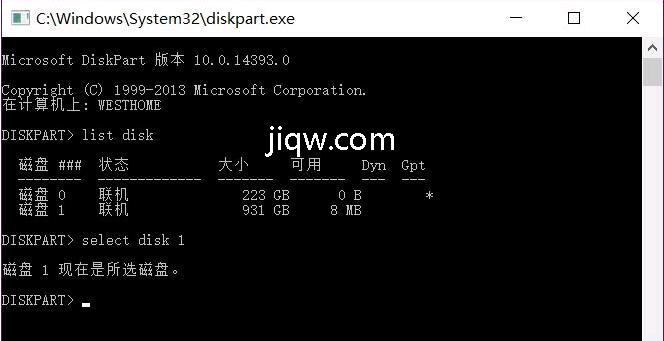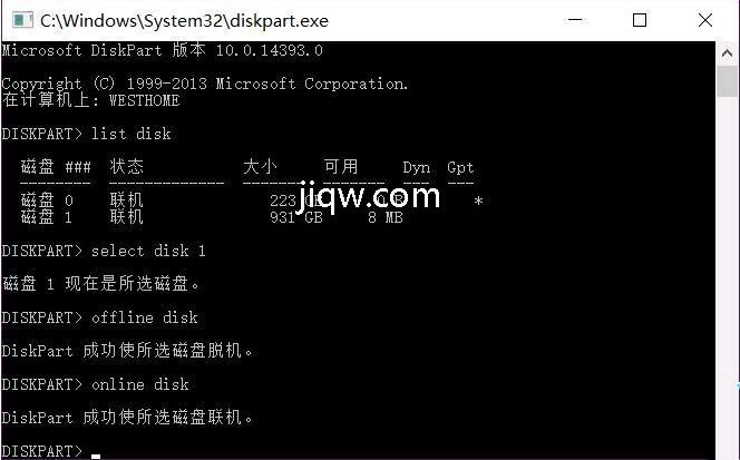 要恢复使用的时候,重新进入diskpart,然后依照使用list disk查看磁盘编号,再用select disk x命令选中要恢复显示的磁盘,最后输入