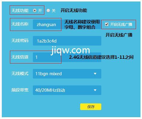 登录路由器管理界面,在 路由设置 >> 无线设置 界面,确保 无线功能 和 无线广播 是开启状态,检查是否设置了中文的无线名称(SSID)或无线名称中包含了特殊字符,建议修改无线名称为字母、数字的任意组合。2.4G无线信道推荐在1-11的范围内。修改后点击 保存,如下图所示: