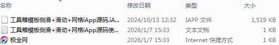 【极全网】工具箱模板侧滑+滑动+网格iApp源码目录1个子文件夹0个文件3个