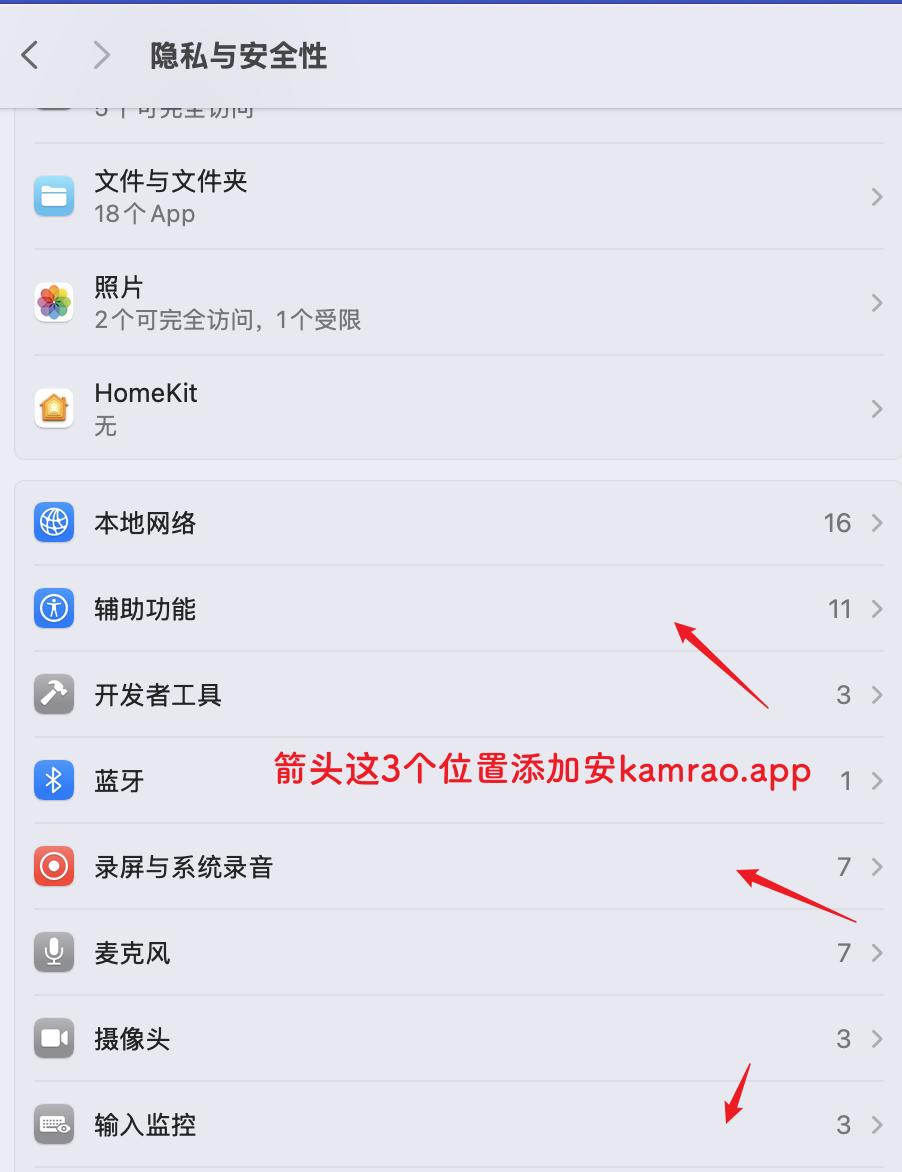 - 如何设置:系统偏好设置 > 安全性与隐私 > 辅助功能 > 添加Kamrap