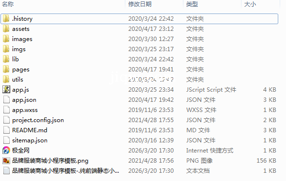 极全网】品牌服装商城小程序模板-.纯前端静态小程序源码目录1个子文件夹7个文件9个