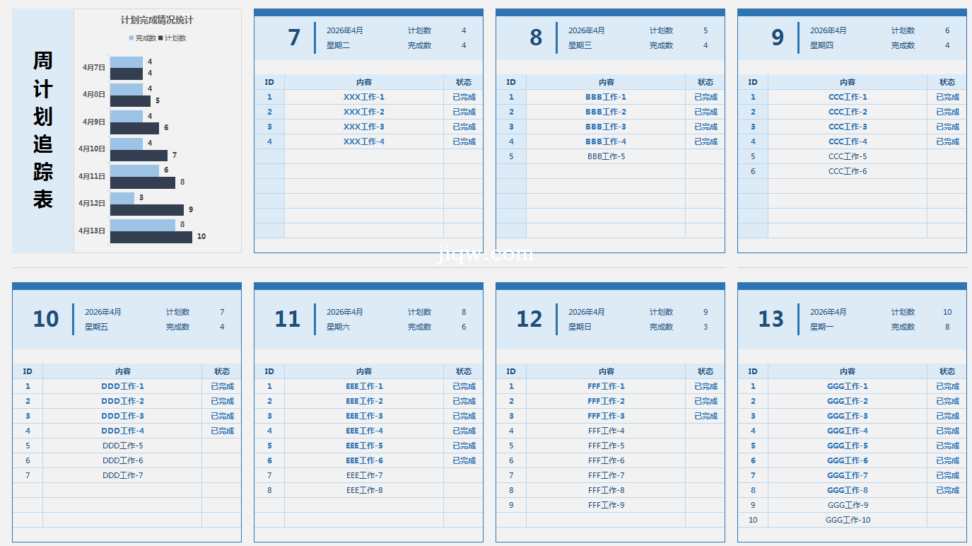 标题:周计划追踪表-自动汇总-图表