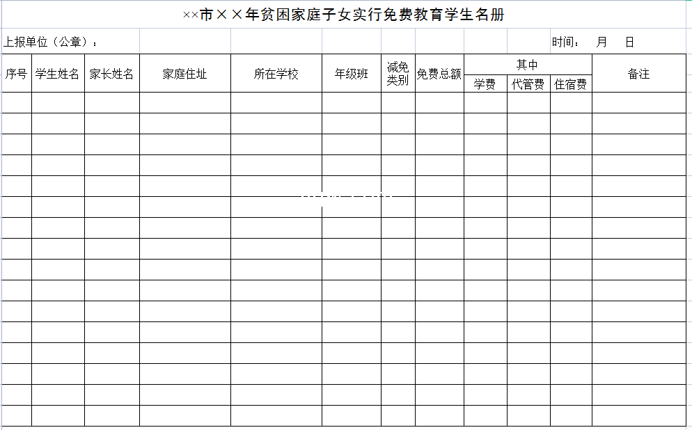 标题:贫困家庭子女实行免费教育学生名册-Excel表格