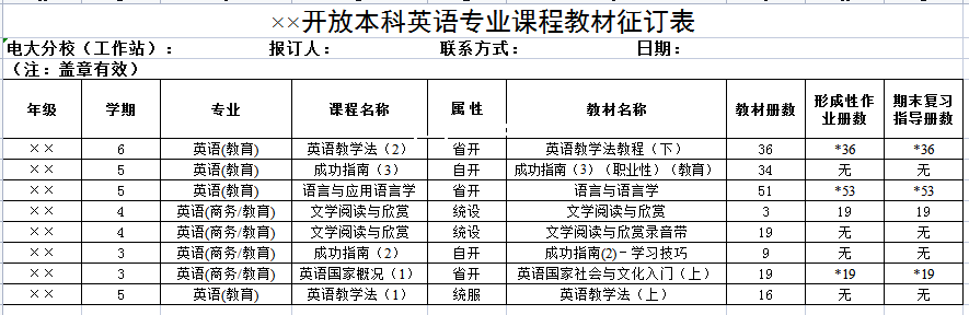 标题:开放本科英语专业课程教材征订表-Excel表格
