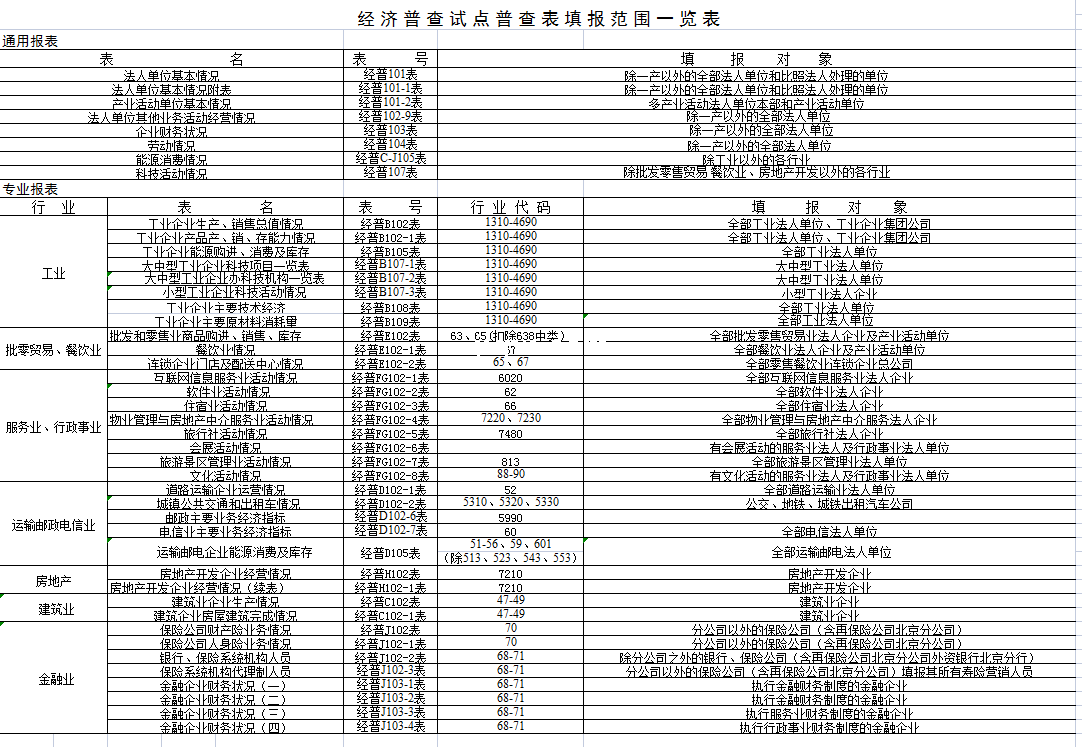 标题:经济普查试点普查表填报范围一览表-Excel表格