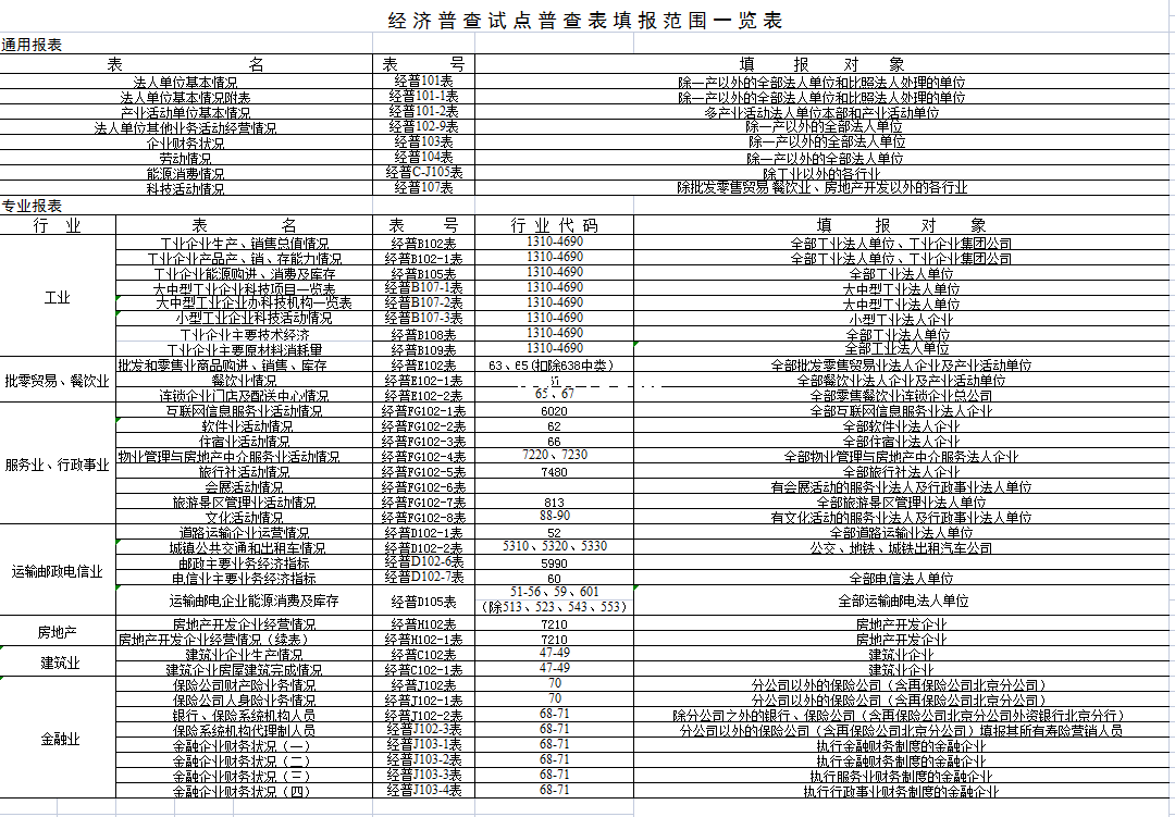 标题:经济普查试点普查表填报范围一览表2-Excel表格