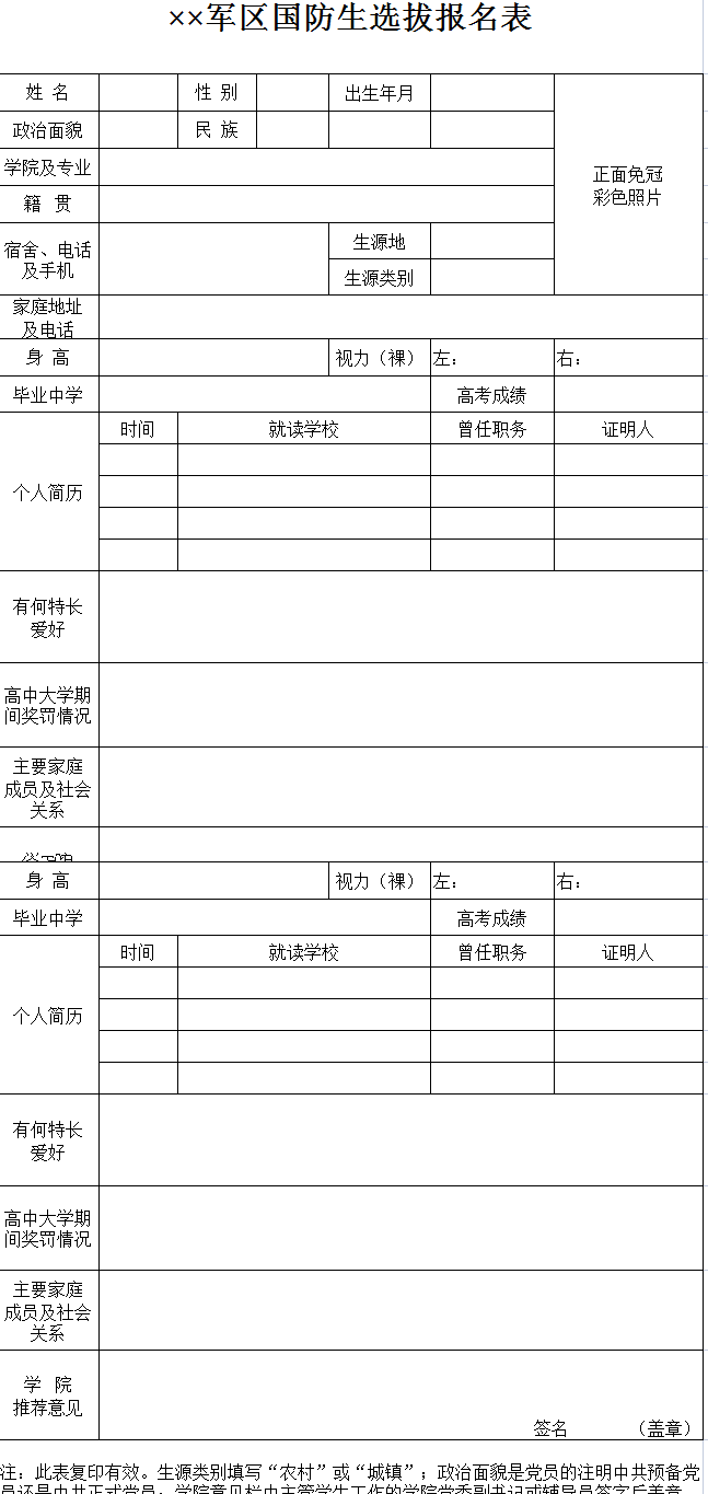 军区国防生选拔报名表-Excel表格