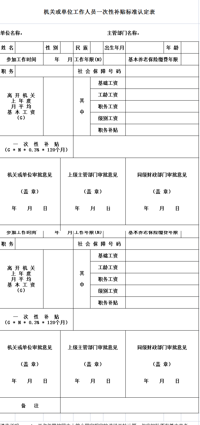 机关或单位工作人员一次性补贴标准认定表-Excel表格