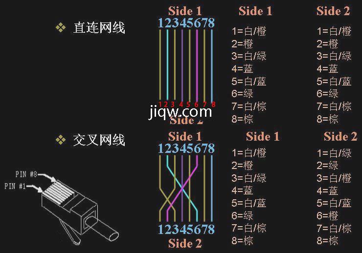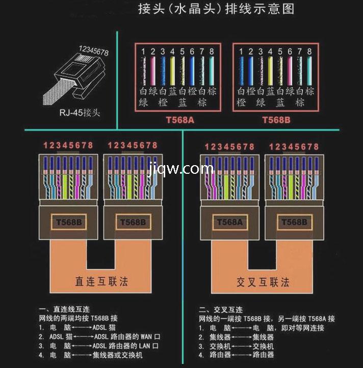 标题:宽带水晶头网线千兆交叉接法直连接法