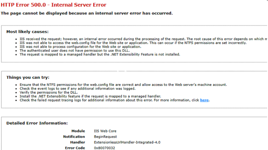 而在 24H2 版本和 Server 2025 中,IIS 会返回 500.0 服务器内部错误并附带错误代码 0x80070032(意为“不支持”)。