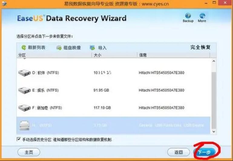 第六步:选择需要恢复的目录(通常是空间比较大的那一个),点击扫描设备;