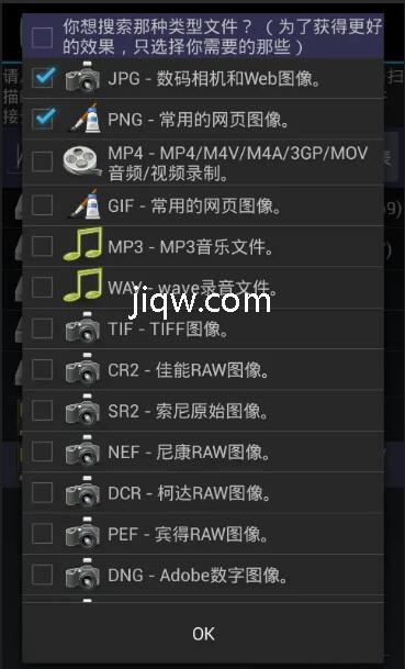 第七步:选择需要恢复的文件格式类型,照片当然选择JPG或PNG的啦,点击OK;