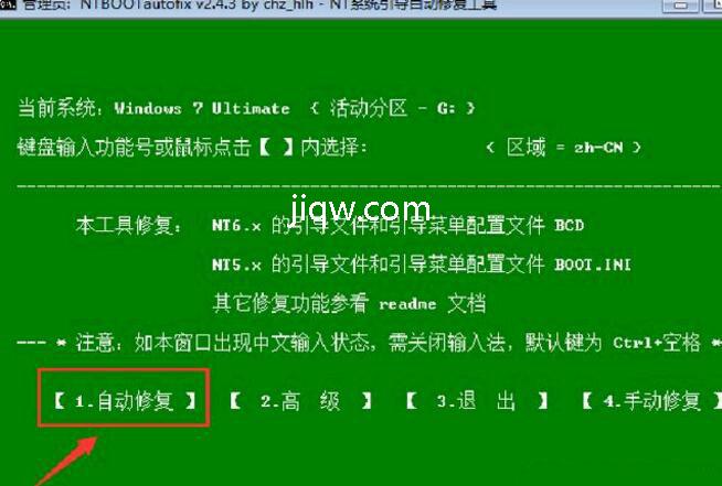 2 .之后选择第一个选项“1.自动修复”的选项,就会出现窗口内的如下修复内容