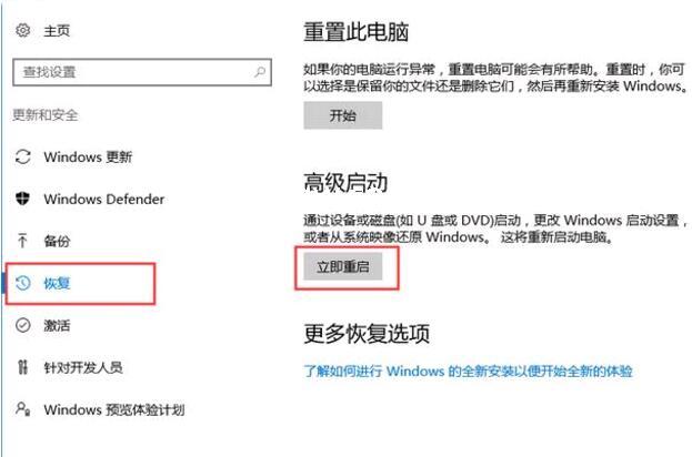 2. 点击更新和安全,进入后在左侧菜单中选择“恢复”,在“恢复”右侧界面中点击高级启动下的立即重启。