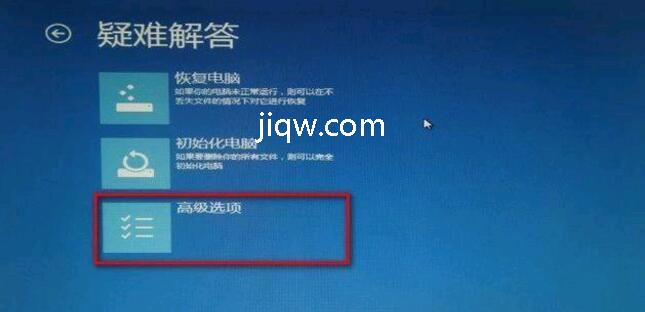 4 .进入疑难解答界面,选择高级选项(若不能开机则重复强制关机可进入)。