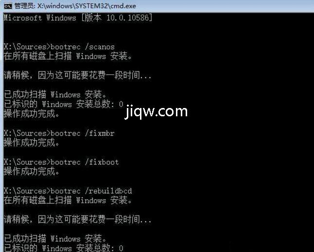 8 .最后依次执行如下命令修复 Win10 的主引导记录并重建 BCD 配置文件,复制代码:01bootrec /scanos,回车执行,复制代码: