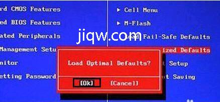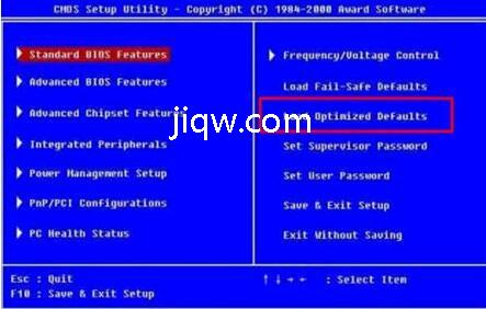 2、进入到bios设置洁面后,将光标移至load optimized defaults按回车键执行。