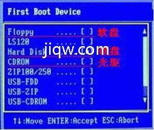 6、也有的情况,Boot菜单并没有Boot Device这样的关键字,而是把几个设备列举出来,前面的设备就是最先启动的,这时按+、-号按键把CDROM调整到硬盘(Hard disk)的上面(加号向上移动一行,减号向下移动一行)。