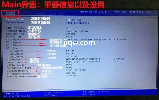 在Main界面中,将显示一些详细的硬件信息,例如BISO版本,主板名称或处理器信息以及一级缓存等等。