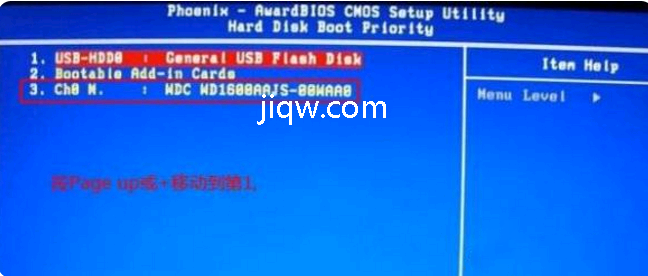 3、WDC WD1600AAJS这一项表明电脑硬盘,根据按Page UP或 号移动到第一的位置,另外按着Shift和=2个键便是 ,最终按F10回车保存。